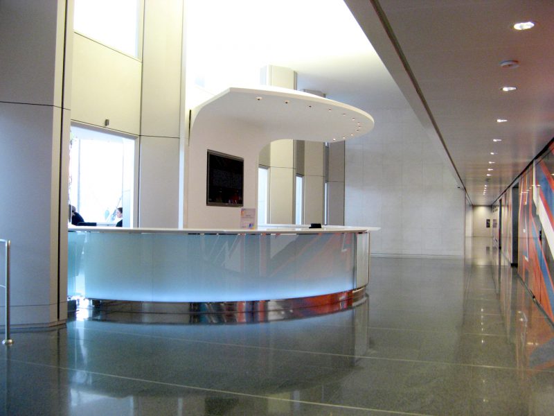 Architectural treatment of the main and secondary halls, by renewing the false ceilings and highlighting the spaces. Creation of a circular bank in the centre of the reception area and reclassification of the waiting area.